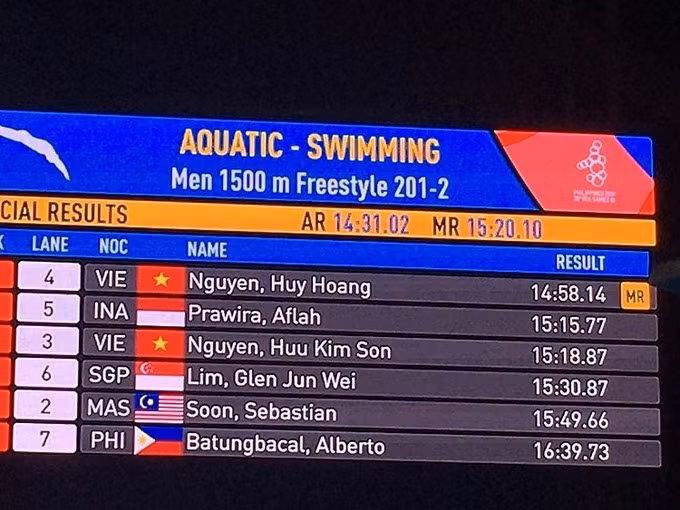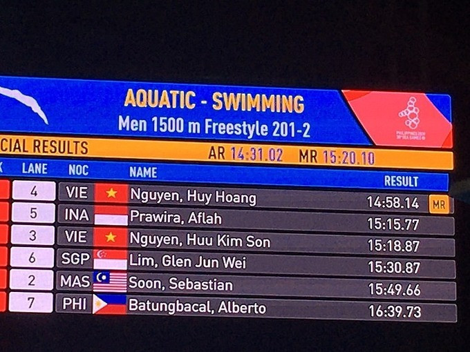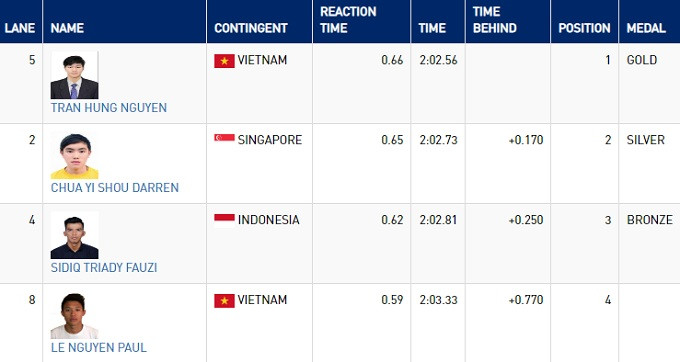 Kình ngư Việt Nam cán đích đầu tiên với thành tích 14 phút 58 giây 14, phá kỷ lục SEA Games. Đồng đội Nguyễn Hữu Kim Sơn của anh giành HCĐ với thời gian 15 phút 18 giây 87.
