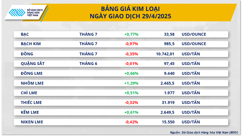 Đối với nhóm kim loại cơ bản, giá đồng COMEX tiếp tục giảm 0,35%, lùi về mức 10.742 USD/tấn. Trong khi đó giá quặng sắt biến động nhẹ, tiếp tục giao dịch quanh mức 97,45 USD/tấn.
