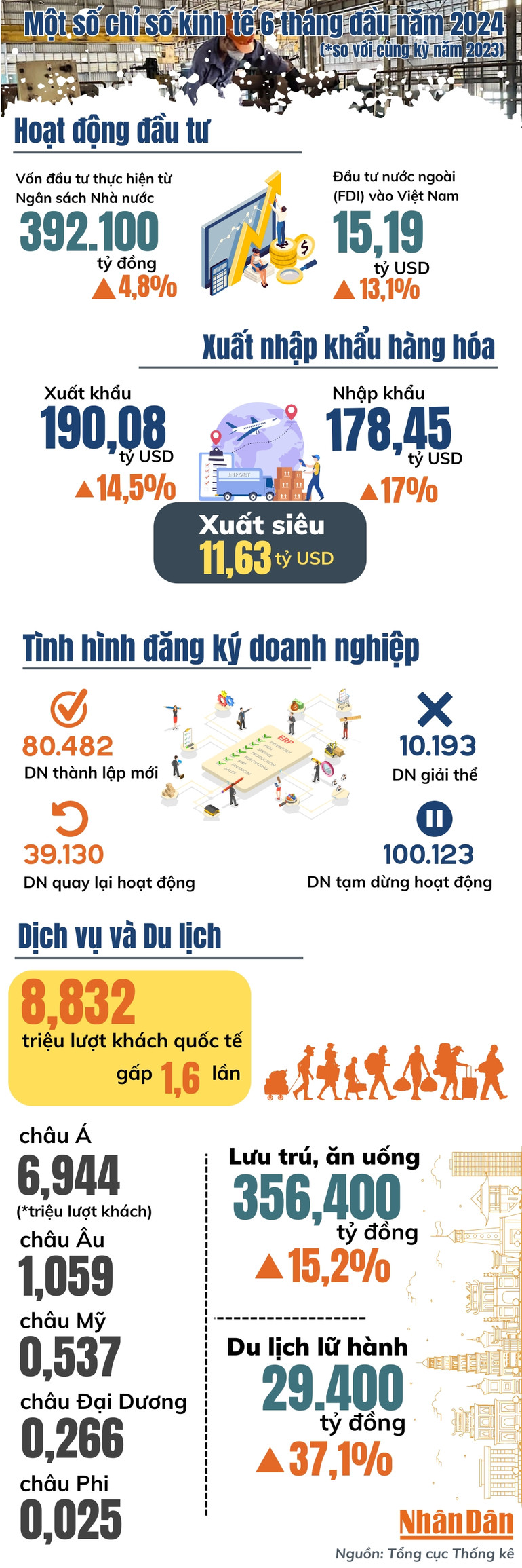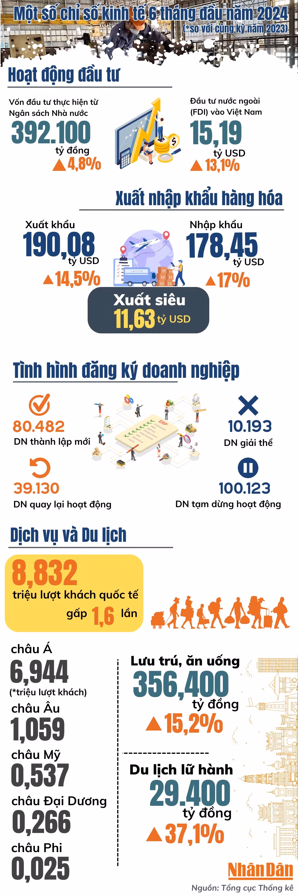 Theo số liệu mới công bố của Tổng Cục Thống kê, kinh tế Việt Nam tiếp tục duy trì tăng trưởng tích cực trong 6 tháng đầu năm 2024, với nhiều chỉ số ấn tượng như Tổng sản phẩm trong nước (GDP) tăng 6,93% so với cùng kỳ năm trước và xuất siêu đạt 11,63 tỷ USD.
