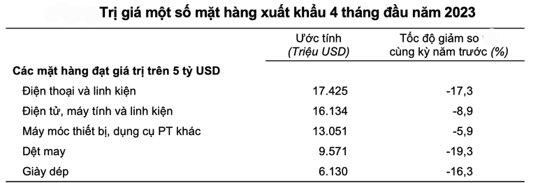 Số liệu vừa được Tổng cục Thống kê (Bộ Kế hoạch và Đầu tư) công bố cho thấy: Kim ngạch xuất khẩu hàng hóa tháng 4/2023 ước đạt 27,54 tỷ USD, giảm 7,3% so tháng trước và giảm 17,1% so cùng kỳ năm trước. Bốn tháng đầu năm 2023, kim ngạch xuất khẩu hàng hóa ước đạt 108,57 tỷ USD, giảm 11,8% so cùng kỳ năm trước. Ở chiều ngược lại, nhập khẩu cũng rơi vào trạng thái lao dốc, kim ngạch nhập khẩu hàng hóa tháng 4/2023 ước đạt 26,03 tỷ USD, giảm 8,1% so tháng trước. Kim ngạch nhập khẩu hàng hóa bốn tháng đầu năm ước đạt 102,22 tỷ USD, giảm 15,4% so cùng kỳ năm trước.