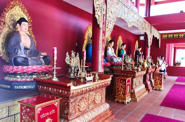 Điện Dược Sư, nơi đặt bảy pho tượng Dược Sư bằng nhựa và các thùng công đức.