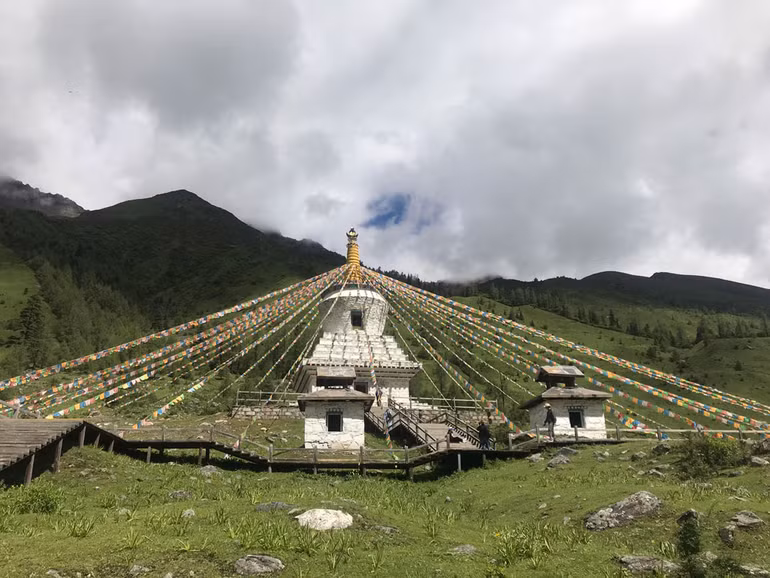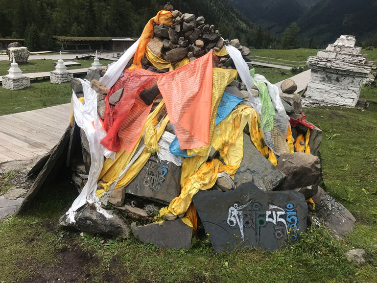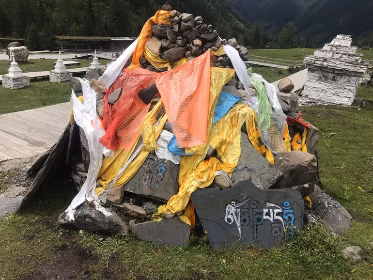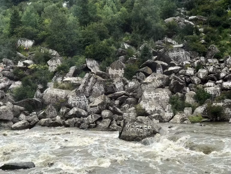 Không chỉ dùng đá, có khi họ còn xếp cả đầu lâu và sừng động vật, phủ những tấm da còn nguyên lông gia súc xùm xoà trên những cái cọc, nhìn rất lạ. Và những tảng đá lớn nhỏ rải rác trên các sườn núi đều được chạm khắc kinh Phật bằng thứ chữ viết bay bướm, sơn phết màu mè đẹp như một tác phẩm nghệ thuật, ngắm mãi mà không chán.