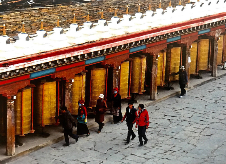 Những dây cờ phướn năm màu rực rỡ tung bay trong gió là hình ảnh xuất hiện với tần suất dày đặc nhất trong suốt dặm dài khám phá “nóc nhà thế giới” của chúng tôi. Thoạt nhìn thoáng qua, tôi cứ đinh ninh đó là những sắc màu của đại kỳ Phật giáo (trắng - đỏ - cam - vàng - lam). Nhưng ngắm kỹ lại mới phát hiện ra khác biệt cơ bản, màu cam đã được thay thế bằng xanh lục. Con số năm vốn rất quen thuộc trong Mật Tông Tây Tạng (hay còn gọi là Phật giáo Tạng truyền) khi vừa tượng trưng cho Ngũ Hành tương sinh tương khắc tạo nên vạn vật vừa ứng với Ngũ Trí đồng thời hợp với Ngũ Uẩn và là Ngũ Bộ Chú để biểu thị sức mạnh và sự thống nhất giữa Ngũ Phương và Ngũ Phật.