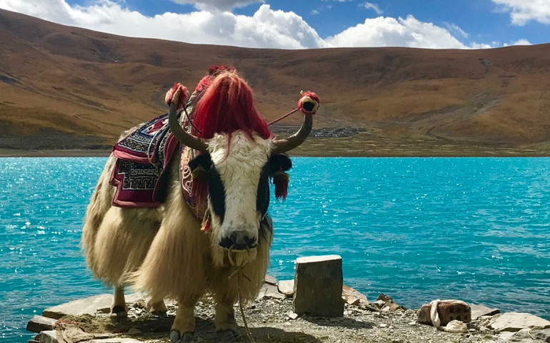 Chú bò yak hiền lành bên hồ thiêng Yamdrok.