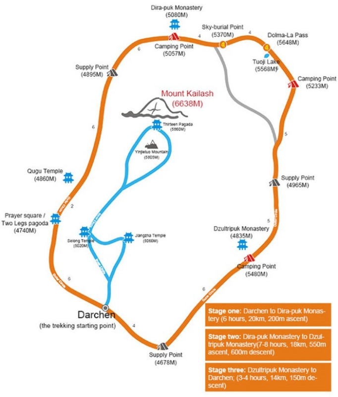 Sơ đồ hành trình kora quanh ngọn núi thiêng Kailash. Để chinh phục quãng đường dài 52 km, du khách phải mất tới ba ngày.
