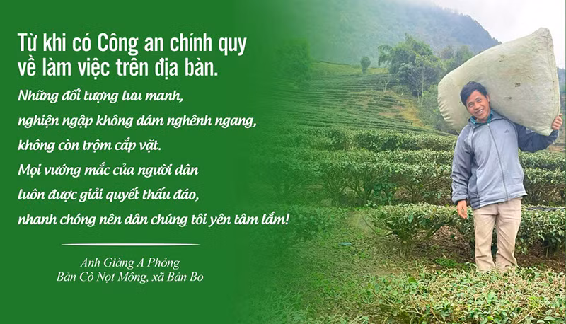 Khi được xin ý kiến đánh giá về Công an xã Bản Bo, những người dân nơi đây đều vui vẻ bày tỏ sự hài lòng, ủng hộ. Ông Giàng A Phỏng, ở bản Cò Nọt Mông, trao đổi: “Từ khi có Công an chính quy về làm việc trên địa bàn, những đối tượng lưu manh, nghiện ngập không có đất mà nghênh ngang, không còn trộm cắp vặt. Mọi vướng mắc của người dân luôn được giải quyết thấu đáo, nhanh chóng nên dân chúng tôi yên tâm lắm!”.