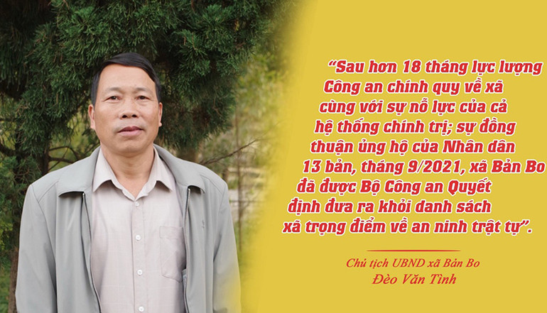 Chủ tịch UBND xã Đèo Văn Tình vui mừng chia sẻ: “Các đồng chí Công an xã luôn hăng hái, nhiệt tình với các hoạt động thiện nguyện như giúp đỡ gia đình khó khăn trên địa bàn dựng nhà, trồng chè phát triển kinh tế và rất gần gũi bà con “nghe dân nói, nói dân hiểu, làm dân tin”, cũng vì thế công tác vận động phong trào quần chúng bảo vệ an ninh Tổ quốc gặp nhiều thuận lợi. Sau hơn 18 tháng lực lượng Công an chính quy về xã, cùng với sự nỗ lực của cả hệ thống chính trị, sự đồng thuận, ủng hộ của Nhân dân, tháng 9/2021, xã Bản Bo đã được Bộ Công an Quyết định đưa ra khỏi danh sách xã trọng điểm về an ninh trật tự”.