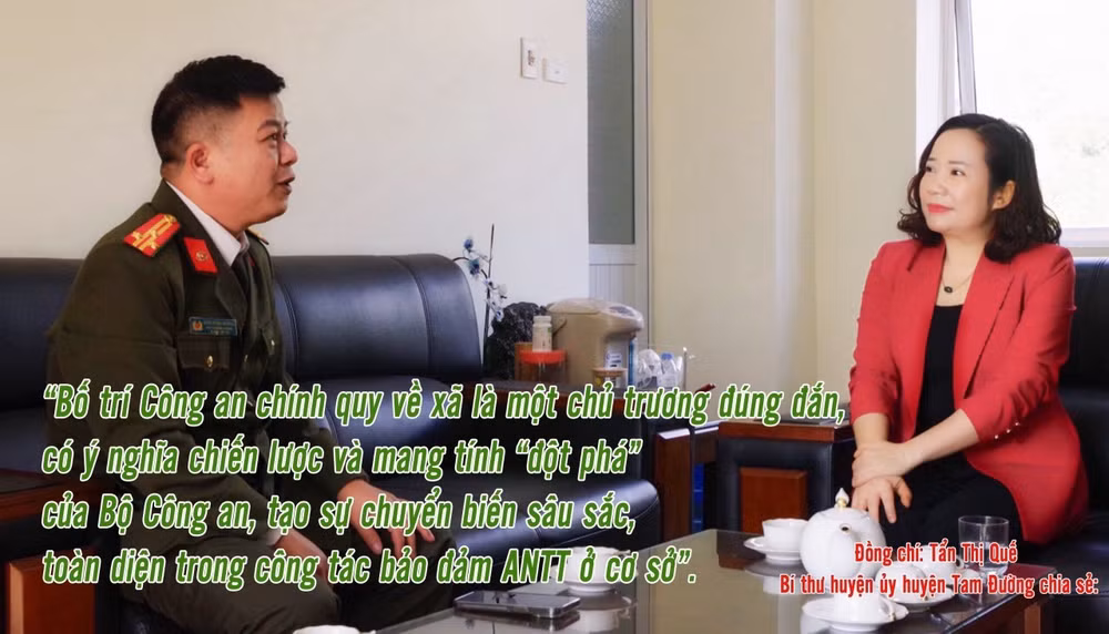 Đồng chí Tẩn Thị Quế - Ủy viên Ban chấp hành Tỉnh ủy, Bí thư huyện ủy Tam Đường đánh giá: “Bố trí Công an chính quy về xã là một chủ trương đúng đắn, có ý nghĩa chiến lược và mang tính đột phá của Bộ Công an, tạo sự chuyển biến tích cực, sâu sắc, toàn diện trong công tác bảo đảm ANTT ở cơ sở”.