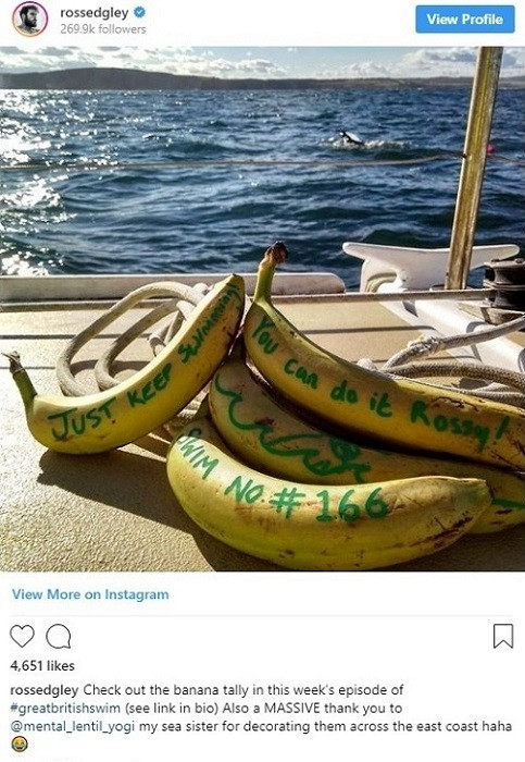 Để bổ sung năng lượng trong suốt hành trình của mình, Edgley phải “cầu viện” tới 500 trái chuối. Những hình ảnh về quá trình lập kỷ lục được Edgley chia sẻ trên trang Instagram cá nhân nhận được rất nhiều lời động viên từ cộng đồng mạng. (Ảnh: Instagram/Ross Edgley)