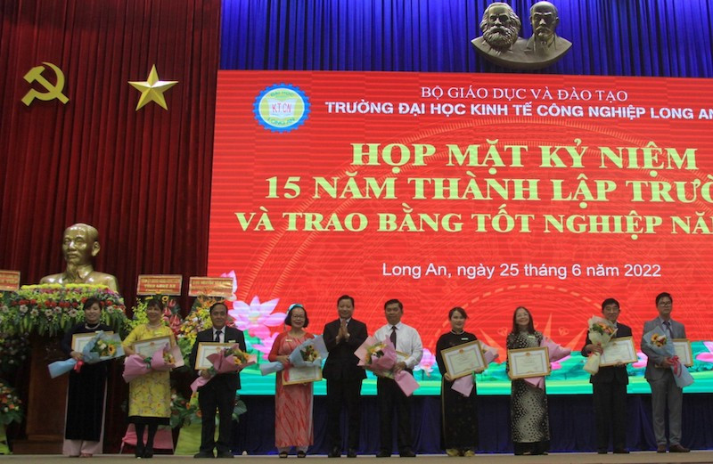Dịp này, UBND tỉnh Long An trao tặng Bằng khen cho 2 tập thể, 10 cá nhân đạt thành tích tiêu biểu trong 15 năm thành lập và phát triển Trường Đại học Kinh tế công nghiệp Long An.