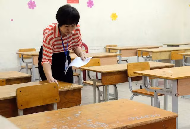Để Kỳ thi diễn ra thực sự nghiêm túc, an toàn không thể thiếu vắng vai trò của những cán bộ làm công tác thi. Có thể với một số thí sinh, đây là những người "đáng sợ" nhưng thực chất, sự hiện diện của các cán bộ coi thi sẽ duy trì không gian an toàn, nghiêm túc để các thí sinh có thể tập trung làm bài thi một cách tốt nhất. Đây cũng là lực lượng sát cánh, gần bên thí sinh nhất trong những buổi thi. Ảnh: Cán bộ làm công tác coi thi tại điểm thi Trường THPT Việt Đức, Hà Nội đề số báo danh vào chỗ ngồi của thí sinh vào đầu buổi thi.