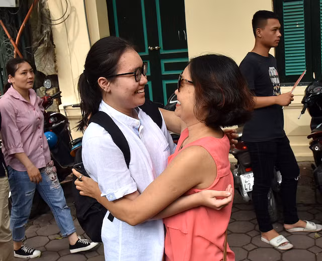 Tại điểm thi Trường THCS Ngô Sĩ Liên (Hà Nội), thí sinh Lê Cẩm Linh vui mừng ôm chầm lấy mẹ ngay sau khi kết thúc buổi thi đầu tiên.