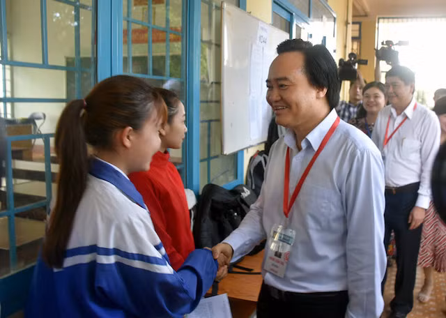 Bộ trưởng GD-ĐT Phùng Xuân Nhạ dành sự quan tâm đặc biệt cho Kỳ thi năm nay. Ảnh: Bộ trưởng động viên các thí sinh tại điểm thi Trường THPT Cư M’Gar, nơi có 888 thí sinh dự thi, trong đó có nhiều con em đồng bào dân tộc Êđê sáng ngày 25-6.