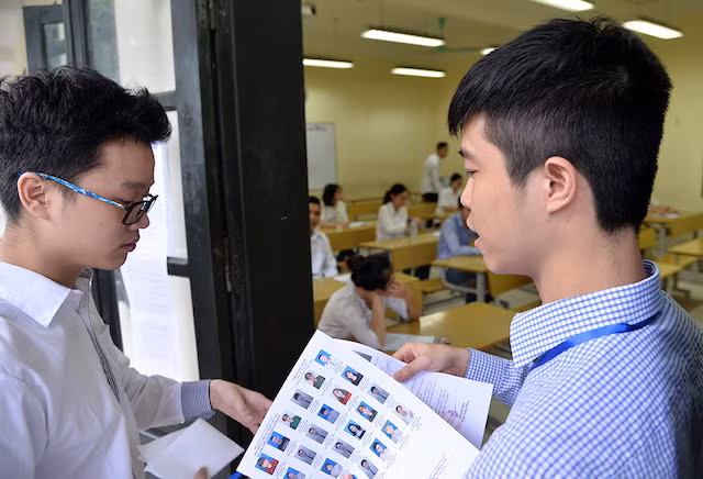 Đối chiếu thông tin nhận dạng của thí sinh trước khi vào phòng thi, một công khâu quan trọng trong nhiệm vụ coi thi của các giám thị.