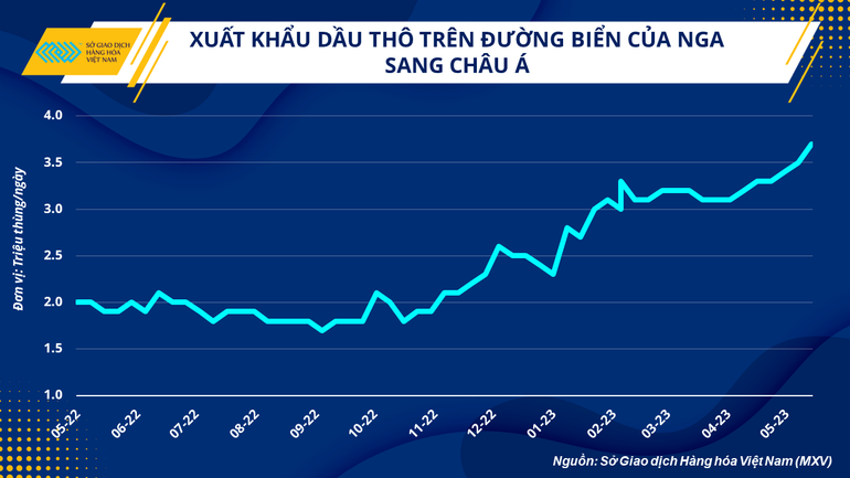 Dữ liệu theo dõi tàu của Bloomberg cho thấy mức xuất khẩu dầu trung bình 4 tuần của Nga sang châu Á đã tăng lên mức kỷ lục trong tuần kết thúc ngày 19/5, đạt 3,6 triệu thùng/ngày và là tuần tăng thứ 6 liên tiếp.