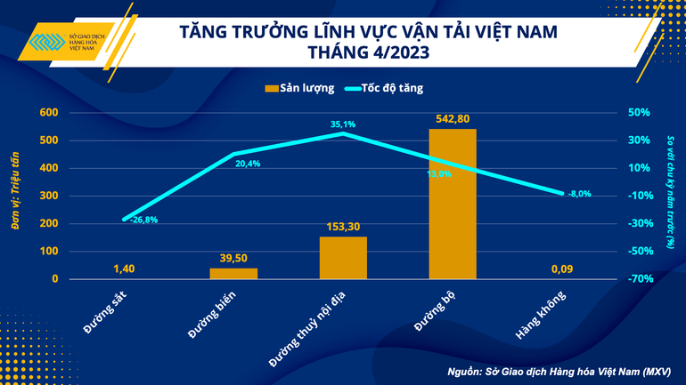 Theo dữ liệu từ Tổng cục Thống kê, trong 4 tháng đầu năm nay, tổng khối lượng hàng hóa vận chuyển của tất cả các loại hình vận tải tại Việt Nam đạt 737 triệu tấn, tăng 17,31% so với cùng kỳ năm ngoái. Trong đó hoạt động vận tải bằng đường biển, đường thủy nội địa và đường bộ đang chứng kiến đà phục hồi tích cực.