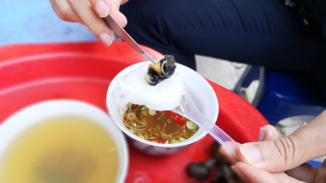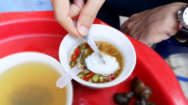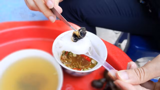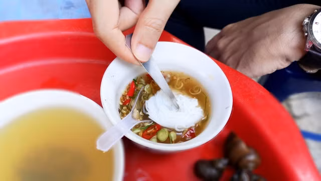 Không phải ăn kiểu nước dùng quen thuộc thanh ngọt nóng hay nguội, mà khi ăn kiểu bún chấm trực tiếp, khêu cùng con ốc béo ngậy trên đầu lưỡi, nhất là trong tiết trời trở lạnh thì độ nóng của ốc, cái cay nồng của ớt và sả trong nước chấm sẽ khiến thực khách vừa ăn vừa xuýt xoa.