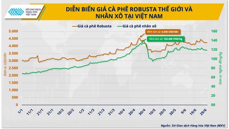 Sau nhịp điều chỉnh giảm 30% vào cuối tháng 4, giá cà-phê Robusta trên Sở Giao dịch liên lục địa châu Âu (ICE-EU) đã nhanh chóng quay về vùng đỉnh lịch sử, trên 4.000 USD/tấn. Tương tự, giá cà-phê nhân xô tại Việt Nam tính đến ngày 3/7 đã lấy lại hơn 25% so với đáy điều chỉnh vào đầu tháng 5, về vùng giá trên 120.000 đồng/kg.