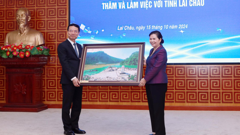 | Lãnh đạo tỉnh Lai Châu tặng quà lưu niệm cho Bộ trưởng Thông tin và Truyền thông và đoàn công tác. |