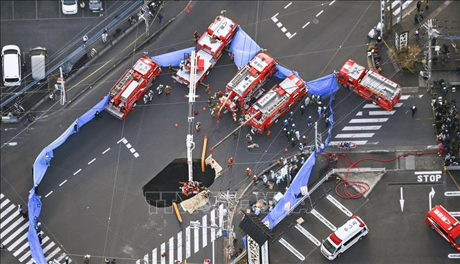 Lực lượng cứu hộ giải cứu tài xế xe tải bị mắc kẹt trong hố tử thần ở thành phố Yashio, Nhật Bản ngày 28/1/2025. (Ảnh: Kyodo/TTXVN)