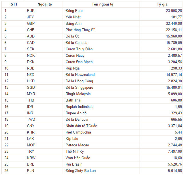 NHNN cũng công bố tỷ giá tính chéo của VND với 26 ngoại tệ khác, áp dụng tính thuế xuất, nhập khẩu có hiệu lực từ ngày 01-01-2016 đến ngày 10-01-2016: