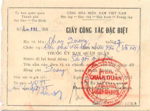 Tôi còn giữ “Giấy công tác đặc biệt” do Ủy ban Quân quản thành phố Sài Gòn - Gia Định cấp cho ông Phan Quang, đặc phái viên Báo Nhân Dân thời hạn ba tháng, từ ngày 1-5-1975 đến ngày 1-8-1975, đóng dấu son. Mặt sau Giấy công tác đã ghi cụ thể nhân thân: dân tộc, chiều cao, cân nặng, điểm riêng trên mặt (kèm Thẻ nhà báo) lại còn kèm thêm mục: Mang vũ khí loại…, số… ...