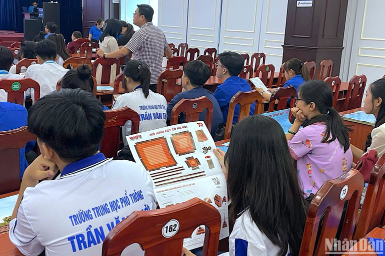 | Giới trẻ và đoàn viên Cà Mau tìm hiểu thông tin về Cột cờ Hà Nội do Báo Nhân Dân trao tặng. |