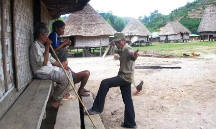 Già làng Clâu Nâm (đội mũ) vận động bà con thôn Prơ Ninh trồng cao-su để xóa nghèo, làm giàu.