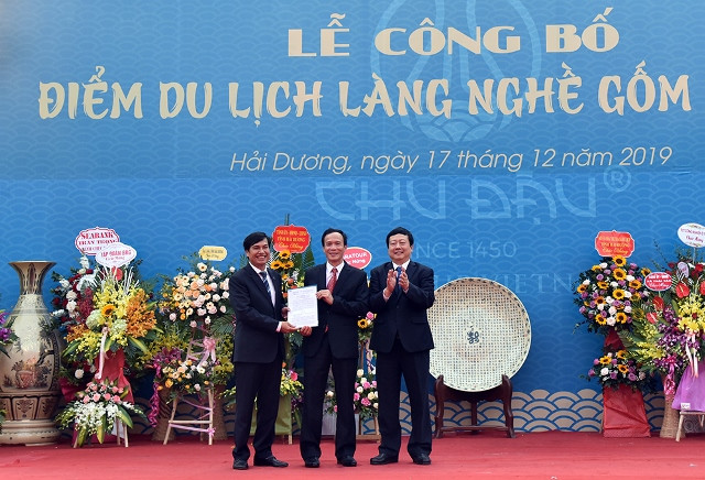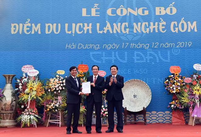 Đồng chí Nguyễn Dương Thái, Chủ tịch UBND tỉnh Hải Dương trao quyết định công nhận điểm du lịch cấp tỉnh cho làng nghề gốm Chu Đậu.