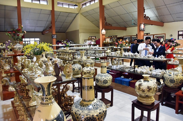 Khách tham quan khu trưng bày các sản phẩm gốm Chu Đậu.