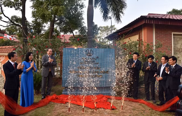 Các đại biểu thực hiện nghi thức gắn biển "Điểm du lịch làng nghề gốm Chu Đậu".