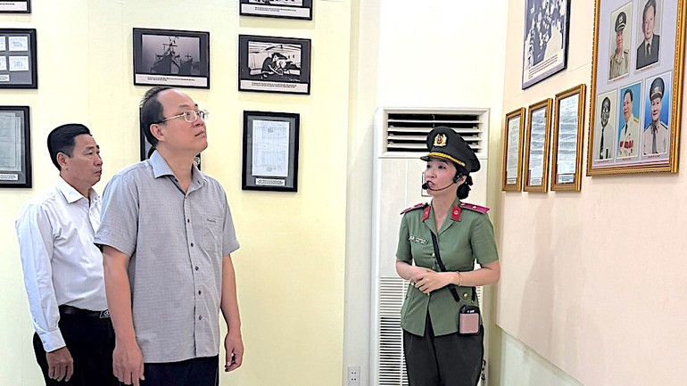 | Bí thư Tỉnh ủy Cà Mau Nguyễn Hồ Hải cùng đoàn công tác nghe giới thiệu tại Nhà trưng bày Kế hoạch phản gián CM12. |