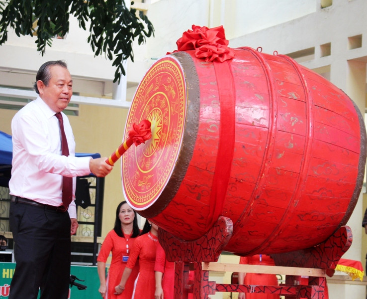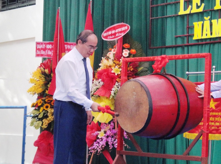 Ủy viên Bộ Chính trị, Bí thư Thành ủy TP Hồ Chí Minh Nguyễn Thiện Nhân đánh trống khai giảng năm học mới (Ảnh: CAO TÂN).