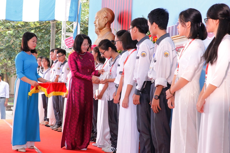 Nhân dịp này, Phó Chủ tịch nước Đặng Thị Ngọc Thịnh tặng học bổng cho 30 học sinh nghèo vượt khó của trường THPT chuyên Lê Hồng Phong đã đạt thành tích cao trong học tập, rèn luyện.