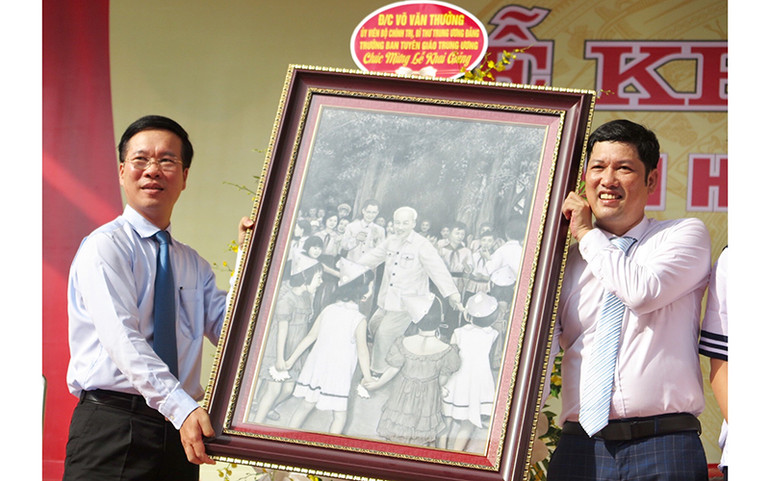 Đồng chí Võ Văn Thưởng tặng hoa và ảnh Bác Hồ chúc mừng thầy, trò trường THCS Chu Văn An, quận Ngô Quyền (Ảnh: QUANG DŨNG).