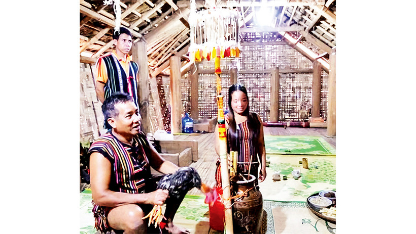 Các lễ vật gồm 3 chén đất đựng cơm lam, tim gan con vật hiến tế và rượu cần được đặt lên giữa hai Yang. Chuẩn bị xong lễ vật, người chủ cúng sẽ gọi con trai, con gái đứng chung quanh ngôi nhà dài và cúng. Cúng xong, người chủ cúng bôi máu gà lên Yang ông, Yang bà, cây nêu, bôi lên chiêng, cột nhà, chóe rượu. Khi hoàn thành nghi lễ, người chủ cúng châm nước vào chóe rượu, mời Yang uống rượu rồi đến già làng, người được tôn trọng nhất uống rượu cần.