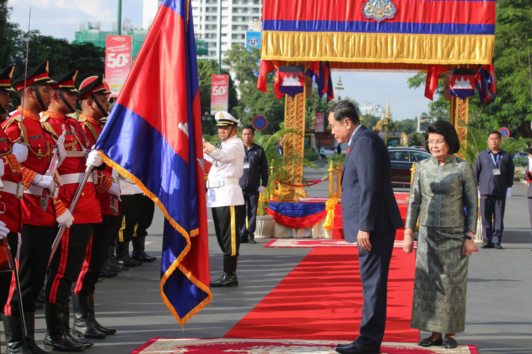 Hai Chủ tịch Quốc hội cùng duyệt Đội danh dự Quân đội Hoàng gia Campuchia. Ngay sau Lễ đón, Chủ tịch Quốc hội Trần Thanh Mẫn và Chủ tịch Quốc hội Samdech Khuon Sudary đã dẫn đầu Đoàn đại biểu cấp cao hai nước tiến hành hội đàm.