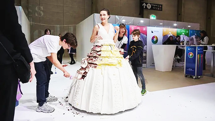 Thợ làm bánh Natasha Coline Kim của tiệm bánh SweetyCakes ở Bern (Thụy Sĩ) đã tạo ra chiếc váy cưới đặc biệt bằng cách sắp đặt các phần bánh kem lại với nhau để tạo hình (trong ảnh). Chiếc váy nặng tới 130kg và được công nhận là “Váy bằng bánh kem lớn nhất thế giới”, đã được một người mẫu mặc tại hội chợ váy cưới ở địa phương, sau đó cắt ra chia cho khách tham quan.