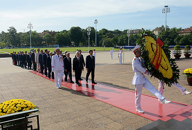 Trước đó, các đồng chí lãnh đạo Đảng, Nhà nước, Ủy ban T.Ư Mặt trận Tổ quốc Việt Nam đã đến đặt vòng hoa và vào Lăng viếng Chủ tịch Hồ Chí Minh.