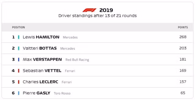 Mặc dù không giành chiến thắng, vị trí thứ nhì vẫn đủ giúp Hamilton củng cố vững chắc ngôi đầu trên bảng tổng sắp thành tích cá nhân sau 13 vòng đua với tổng 268 điểm. Bottas đứng thứ hai với 203 điểm, còn Verstappen vẫn xếp ở vị trí thứ ba với 181 điểm. Trên bảng xếp hạng đồng đội, Mercedes tiếp tục dẫn đầu với 471 điểm, vượt xa Ferrari ở vị trí thứ hai với 326 và Red Bull xếp thứ ba với 254 điểm.