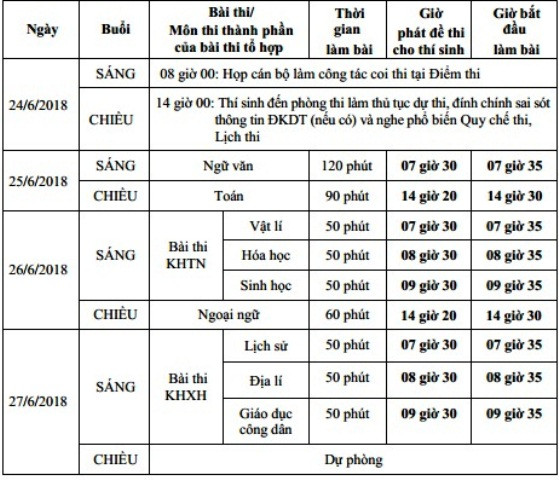 Bộ GD-ĐT đã ban hành Hướng dẫn thực hiện Quy chế thi THPT quốc gia và xét công nhận tốt nghiệp THPT năm 2018. Theo đó, kỳ thi sẽ diễn ra từ ngày 24 đến 27-6. Giống như năm 2017, Kỳ thi năm nay được tổ chức với năm bài thi, trong đó, ba bài thi độc lập: Toán, Ngữ văn, Ngoại ngữ và hai bài thi tổ hợp: Khoa học tự nhiên (tổ hợp các môn Vật lý, Hóa học, Sinh học) và Khoa học xã hội (tổ hợp các môn Lịch sử, Địa lý, Giáo dục công dân).