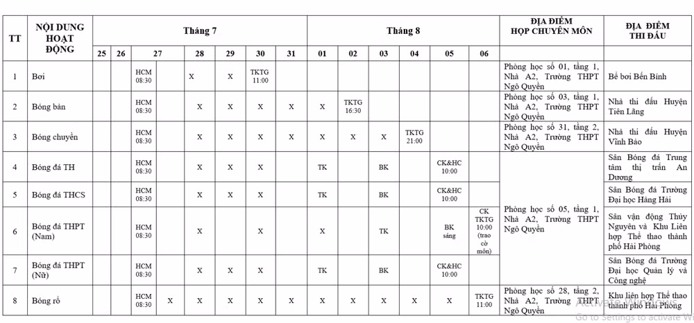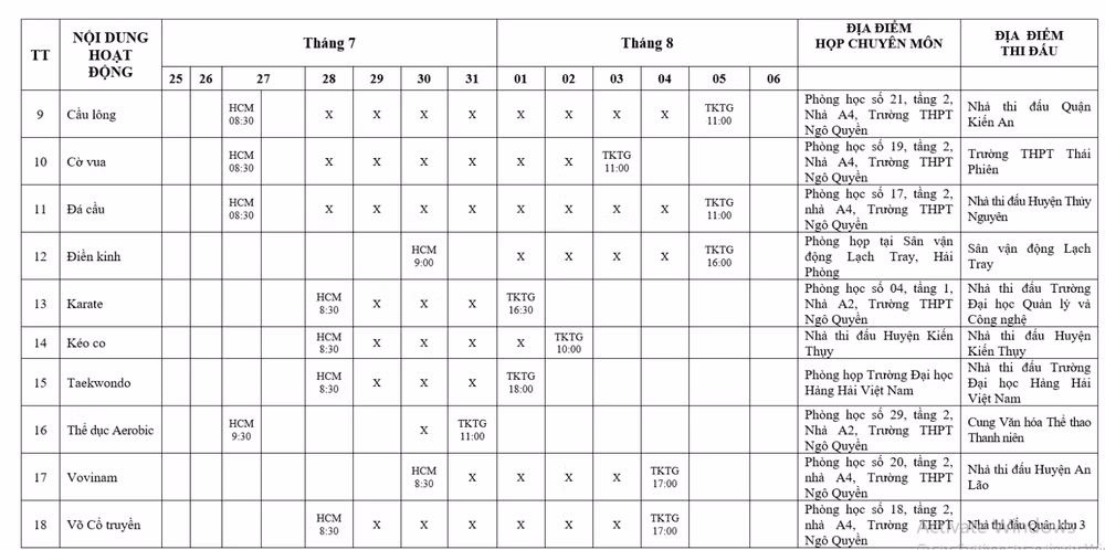 Trong đó, các từ viết tắt được hiểu như sau: HMC là họp chuyên môn; X là thời gian thi đấu; CK&HC: Chung kết và Trao huy chương; TKTG là Tổng kết trao giải; CK là chung kết.