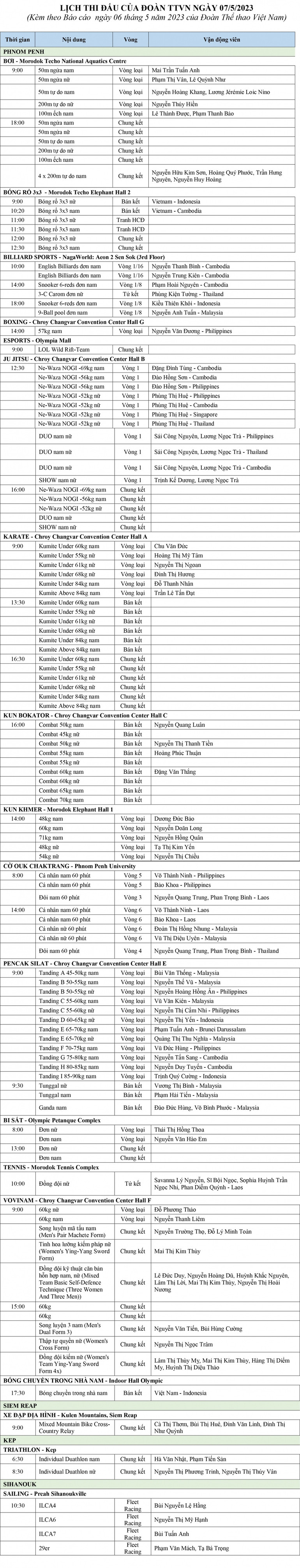 Trong ngày thi đấu thứ hai (7/5), Đoàn thể thao Việt Nam hứa hẹn gặt hái nhiều thành tích khi có các đại diện góp mặt ở chung kết những bộ môn thế mạnh như bơi lội, karate, vovinam, E-sports, boxing, jujitsu. Sau ngày thi đấu thứ nhất, Việt Nam hiện có được tổng cộng 6 Huy chương Vàng, 11 Huy chương Bạc và 19 Huy chương Đồng, tạm xếp thứ 5 trên bảng tổng sắp.