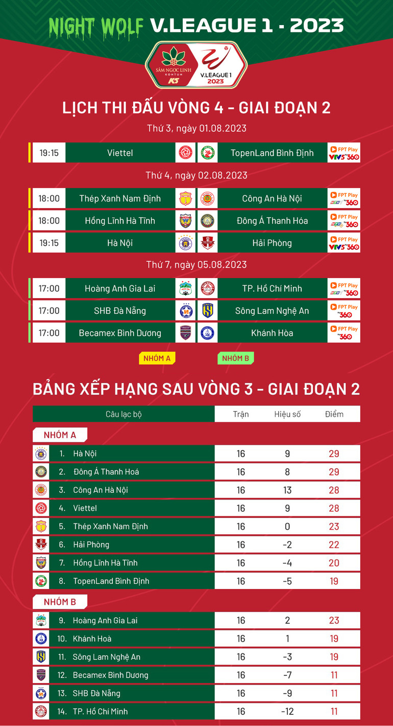 Vòng 4 giai đoạn 2 sẽ bắt đầu ngay từ ngày hôm nay (1/8) với trận đấu giữa Viettel và Bình Định. Ngày mai (2/8) sẽ diễn ra 3 trận đấu của nhóm A gồm: Nam Định - Công an Hà Nội, Hà Tĩnh - Thanh Hóa và Hà Nội - Hải Phòng. Cuối tuần sẽ là cuộc đấu ở nhóm B tranh trụ hạng.