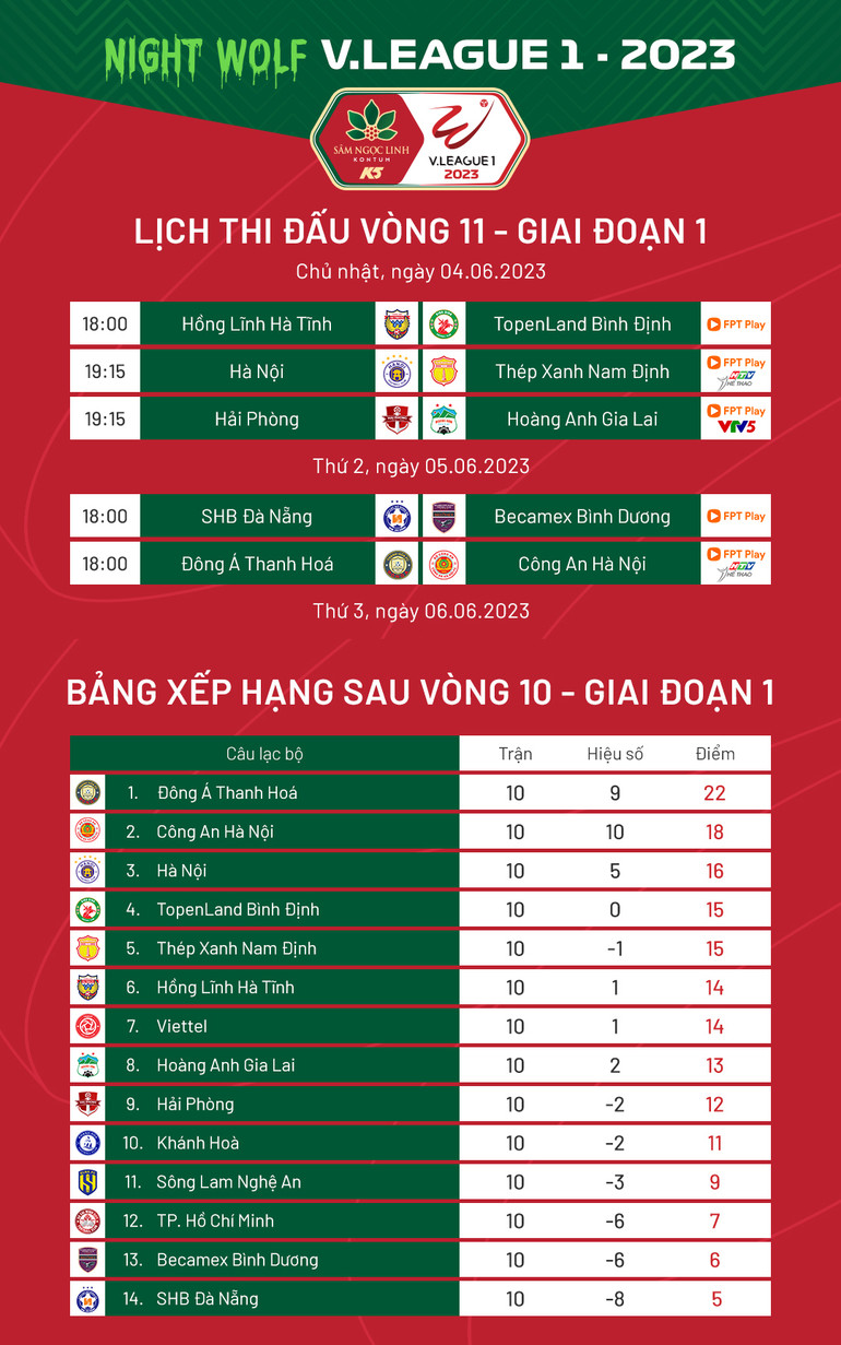 Vòng 11 V-League 2023 mở đầu bằng cuộc đối đầu giữa Hồng Lĩnh Hà Tĩnh và Bình Định vào chiều tối nay (4/6). Tâm điểm của vòng đấu sẽ là trận đại chiến giữa hai đội đứng đầu là Thanh Hóa và Công an Hà Nội.