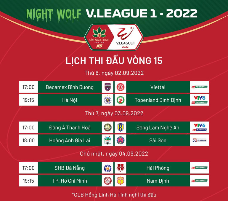 Lịch thi đấu vòng 15 V-League: Hà Nội chạm trán Topenland Bình Định