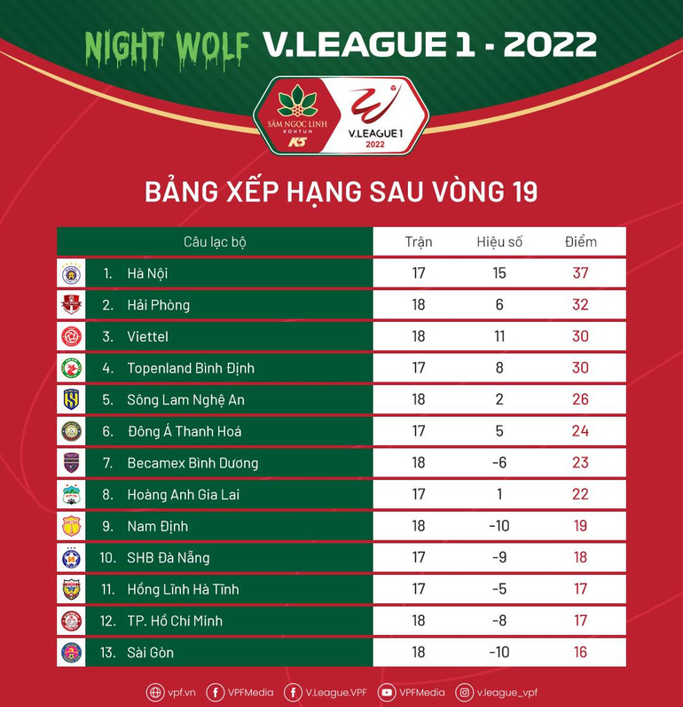 CLB Hà Nội hiện đã củng cố vị trí dẫn đầu của mình 1 cách vững chắc khi hơn các đội bóng bám đuổi phía sau lần lượt là Hải Phòng, Viettel tới 5 và 7 điểm. Thậm chí thầy trò huấn luyện viên Chun Jae-ho còn đang thi đấu ít hơn 1 trận.