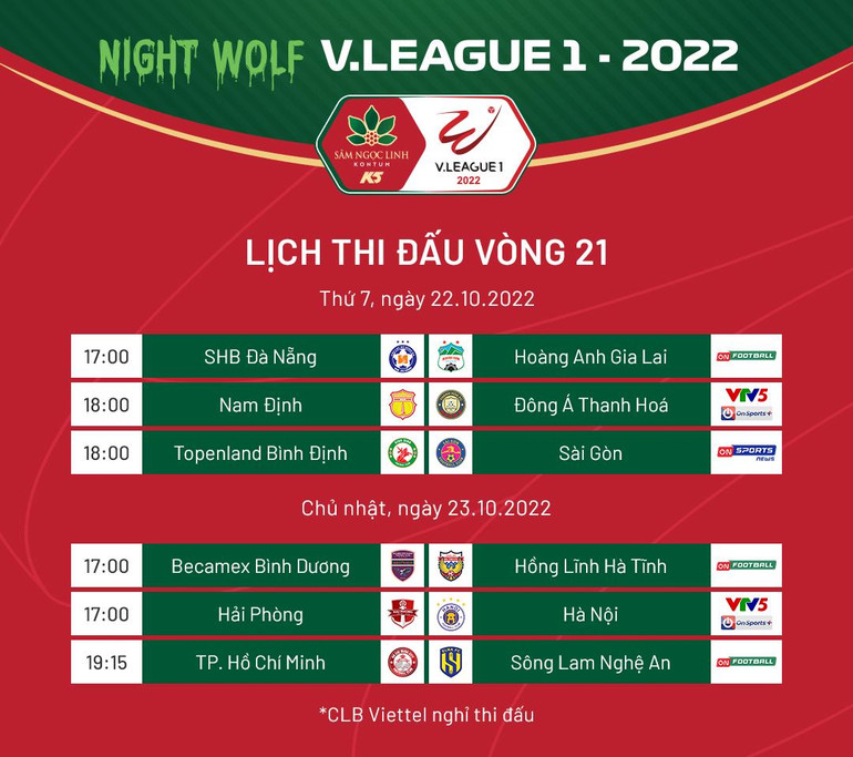 Ngày hôm nay (22/10), vòng 21 V-League diễn ra 3 trận đấu. Trận đấu sớm nhất lúc 17 giờ là SHB Đà Nẵng tiếp đón Hoàng Anh Gia Lai. Đây là một trận đấu khá hấp dẫn. Nếu có thêm 1 chiến thắng đội bóng của huấn luyện viên Phan Thanh Hùng sẽ thoát ra khỏi khu vực nguy hiểm, ở chiều ngược lại, Hoàng Anh Gia Lai rất cần chấm dứt chuỗi trận thất bại kéo dài của mình, nếu như họ không muốn rơi vào nhóm trụ hạng.