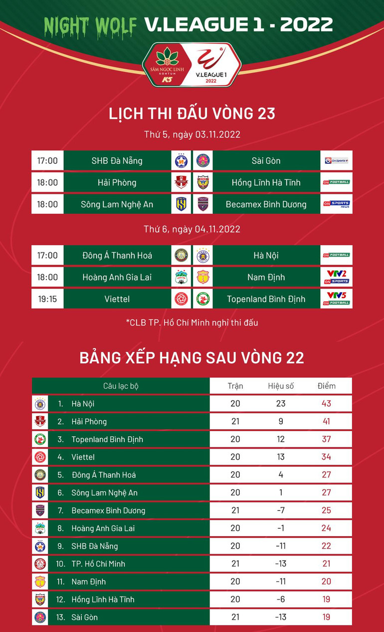 Theo đó, đội nhất bảng là Hà Nội FC làm khách trước Thanh Hóa vào 17 giờ ngày 4/11. Trong khi đó, vào 18 giờ ngày 3/11, Hải Phòng đặt mục tiêu 3 điểm trước Hồng Lĩnh Hà Tĩnh để tiếp tục bám đuổi đội bóng Thủ đô.