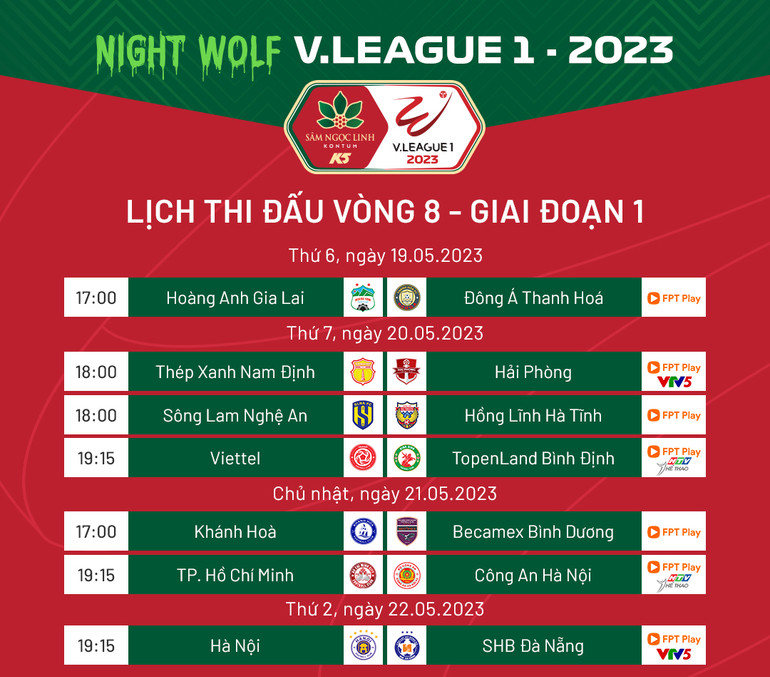 Theo lịch thi đấu vòng 8 V-League 2023 còn có các cặp đấu hấp dẫn như: Sông Lam Nghệ An - Hồng Lĩnh Hà Tĩnh, Viettel FC - Topenland Bình Định, Khánh Hòa FC - Becamex Bình Dương, câu lạc bộ TP Hồ Chí Minh - Công an Hà Nội FC, Hà Nội FC - SHB Đà Nẵng.